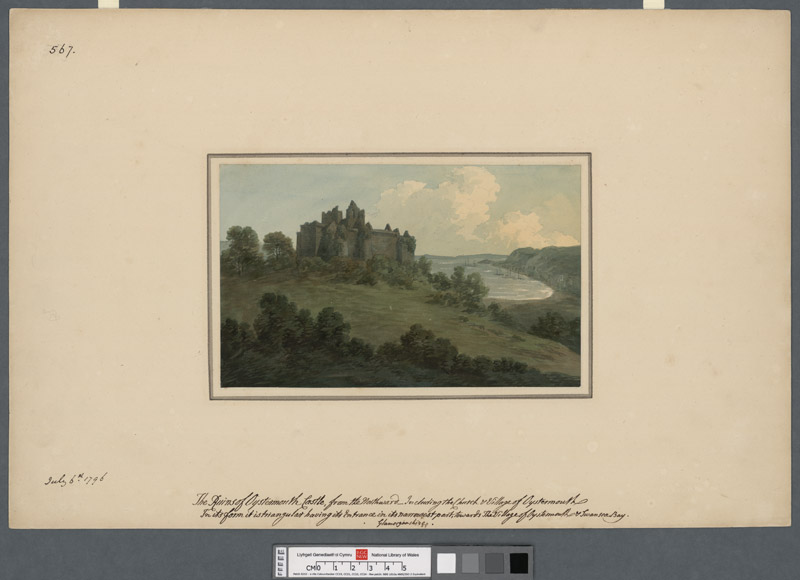 The ruins of Oystermouth Castle from the northward, including the church and village of Oystermouth (PA4379)